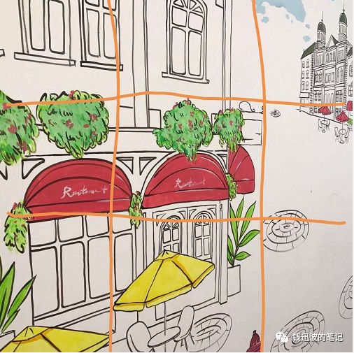 有阴井盖圈,红色大阳伞2个,红色雨棚和绿草坛半个,休闲桌椅